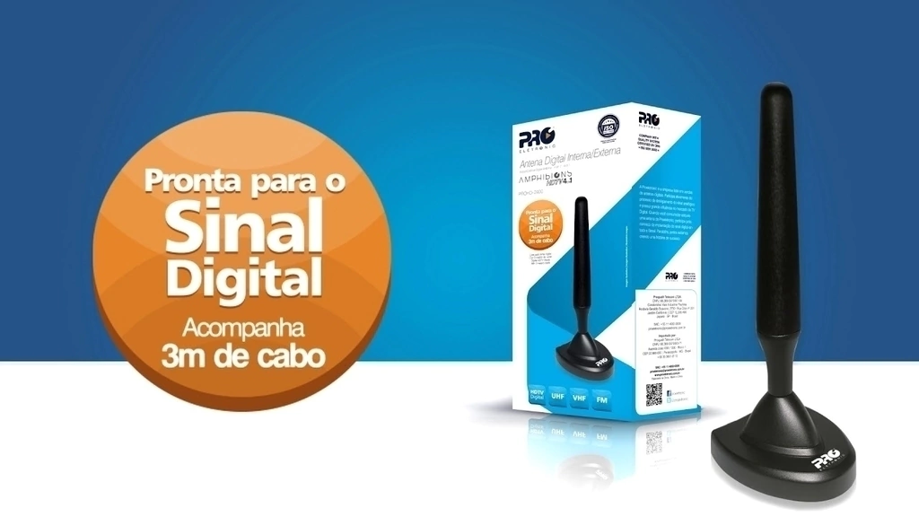 A Antena digital PROHD-2400 é uma solução para apartamentos com uma boa condição de recepção de sinal digital, super compacta e discreta, basta conectar a entrada Antena IN da TV, efetuar a sintonia de canais e pronto. É só aproveitar o melhor dos canais digitais na Televisão. Além disso, acompanha 3 metros de cabo e base magnética, ideal para posicionar em racks e prateleiras. E se quiser, pode ser usada externamente!