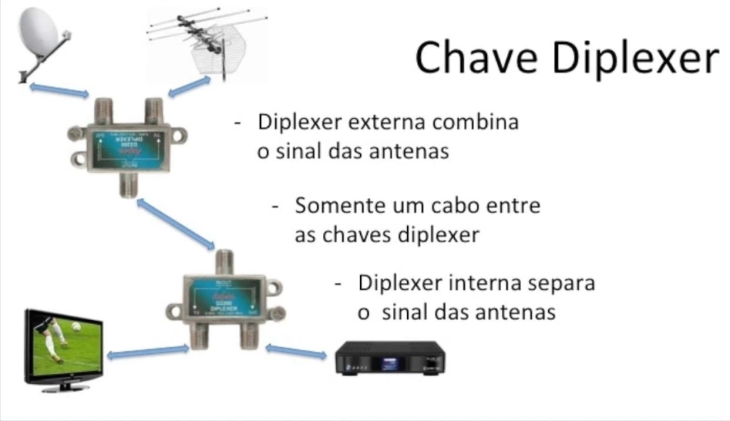 O diplexer é utilizado para combinar sinais diferentes, podendo misturar sinal de satélite Banda KU (parabólica, SKY ou Claro) mais o sinal terrestre UHF.