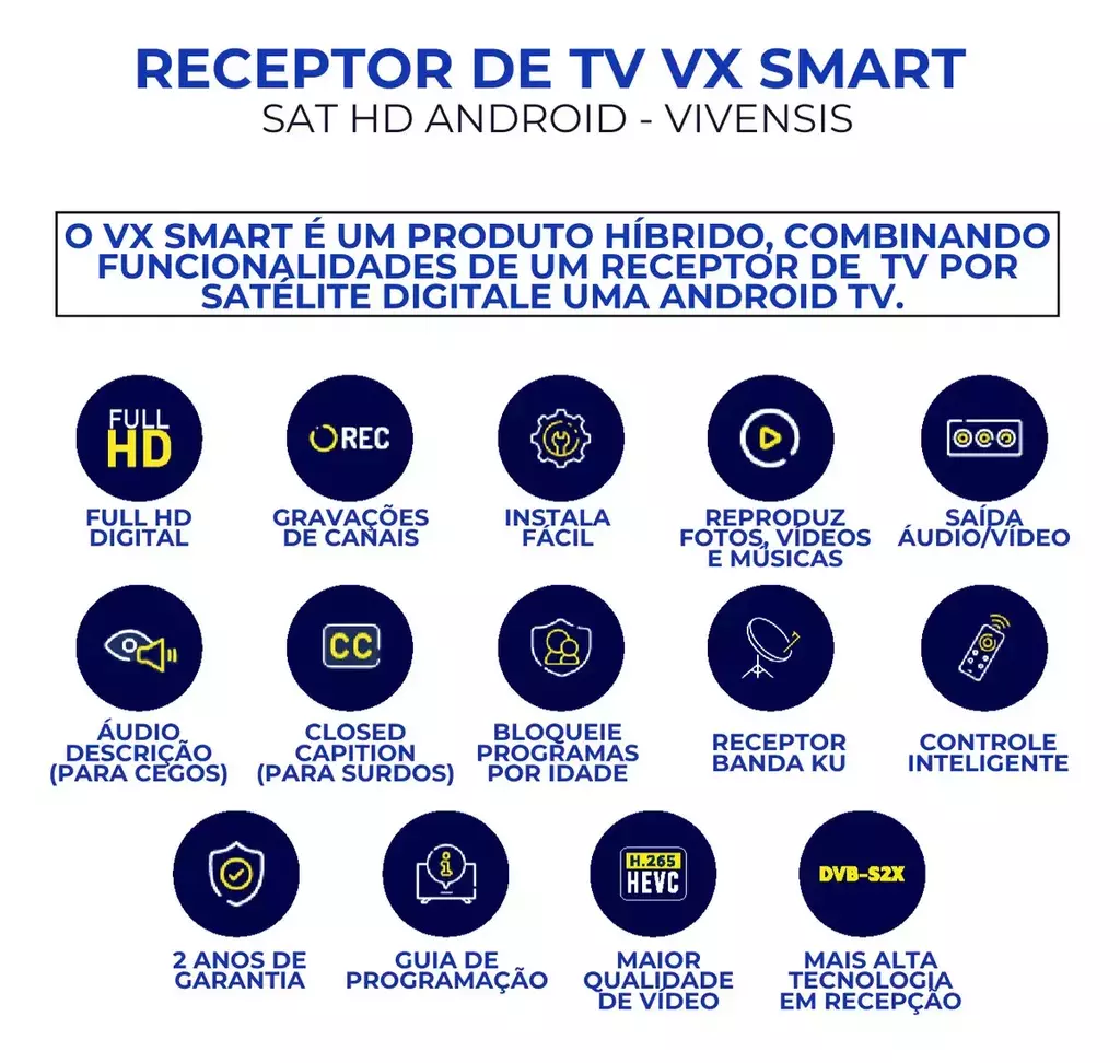 Transforme sua TV em um centro de entretenimento completo com o Receptor de TV Vivensis VX Smart. Este dispositivo híbrido combina o melhor da TV digital via satélite com as funcionalidades avançadas do Android TV, proporcionando uma experiência única para toda a família.